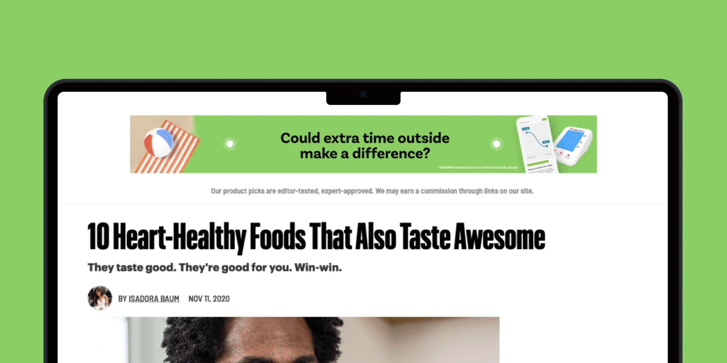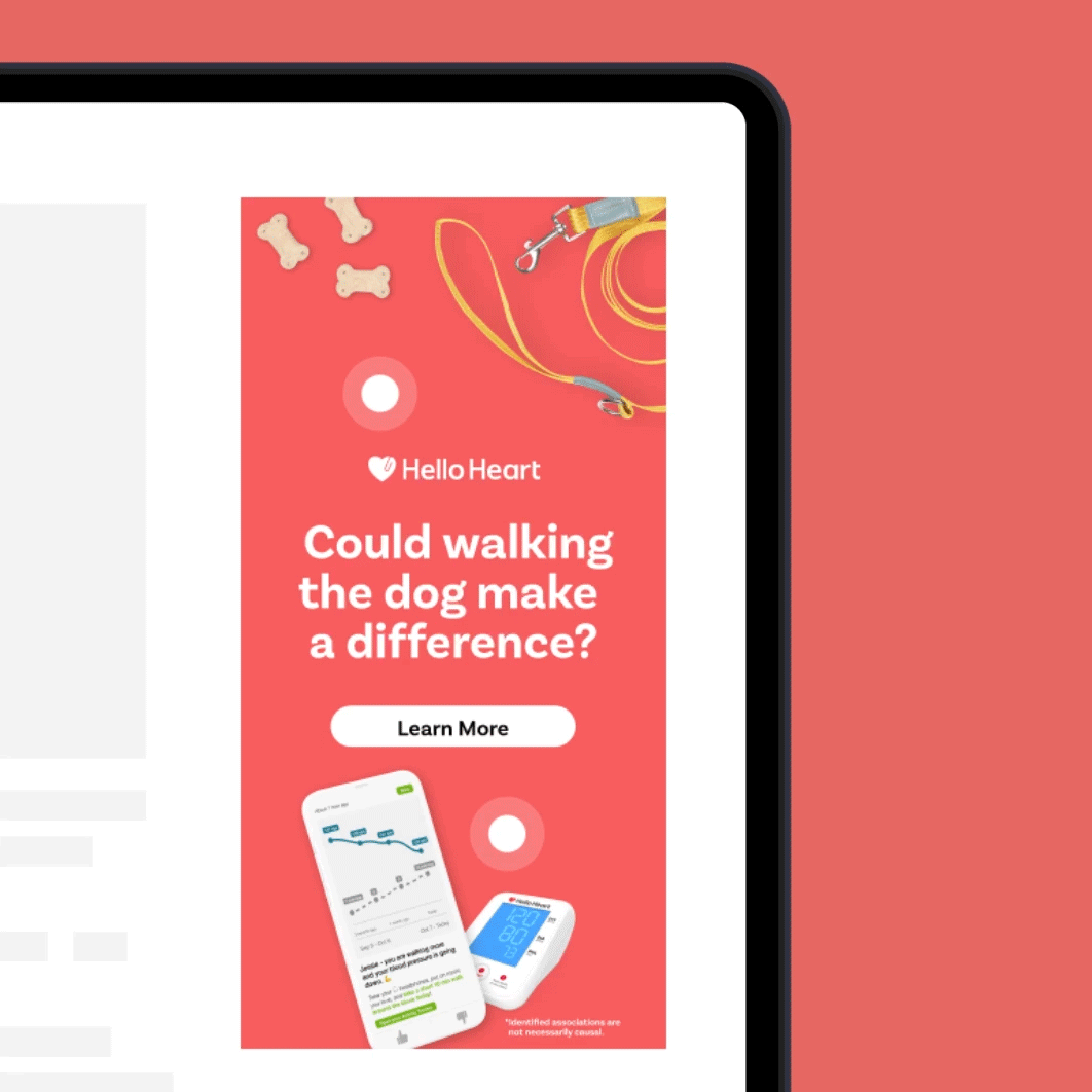 While working with Hello Heart, I led and managed this award-winning campaign through concepting, design, and creative production for their first integrated, national B2B brand awareness campaign for the Dot-to-Dot feature. I oversaw full campaign design and production, including the photoshoot and video shoot shot oversees, ensuring the creative vision was executed seamlessly. The work included a landing page, digital banners, OOH billboards, and a commercial spot, all designed to make heart health approachable and engaging.