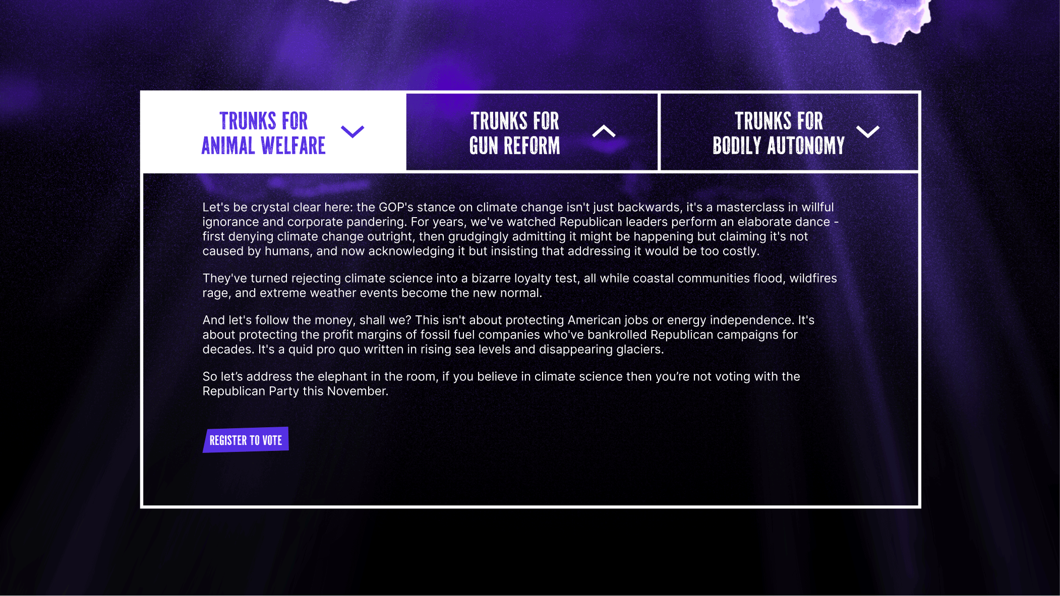 Trunks for Change, my wonderful brain child, was developed at Scout Lab, designed to encourage voter registration for the 2024 election while raising awareness of key issues facing the U.S. under the GOP. I led full creative concepting and execution, including visual identity development, animation, video editing, talent sourcing, high-end swag design and production, and photoshoot direction, handling every aspect of the visual creative work.. Partnering with People For the American Way and collaborating with artists, the campaign combined civic engagement with creative fundraising through an art auction. This project served as a fully realized, high-impact initiative aimed at inspiring people to vote for the planet and the future.