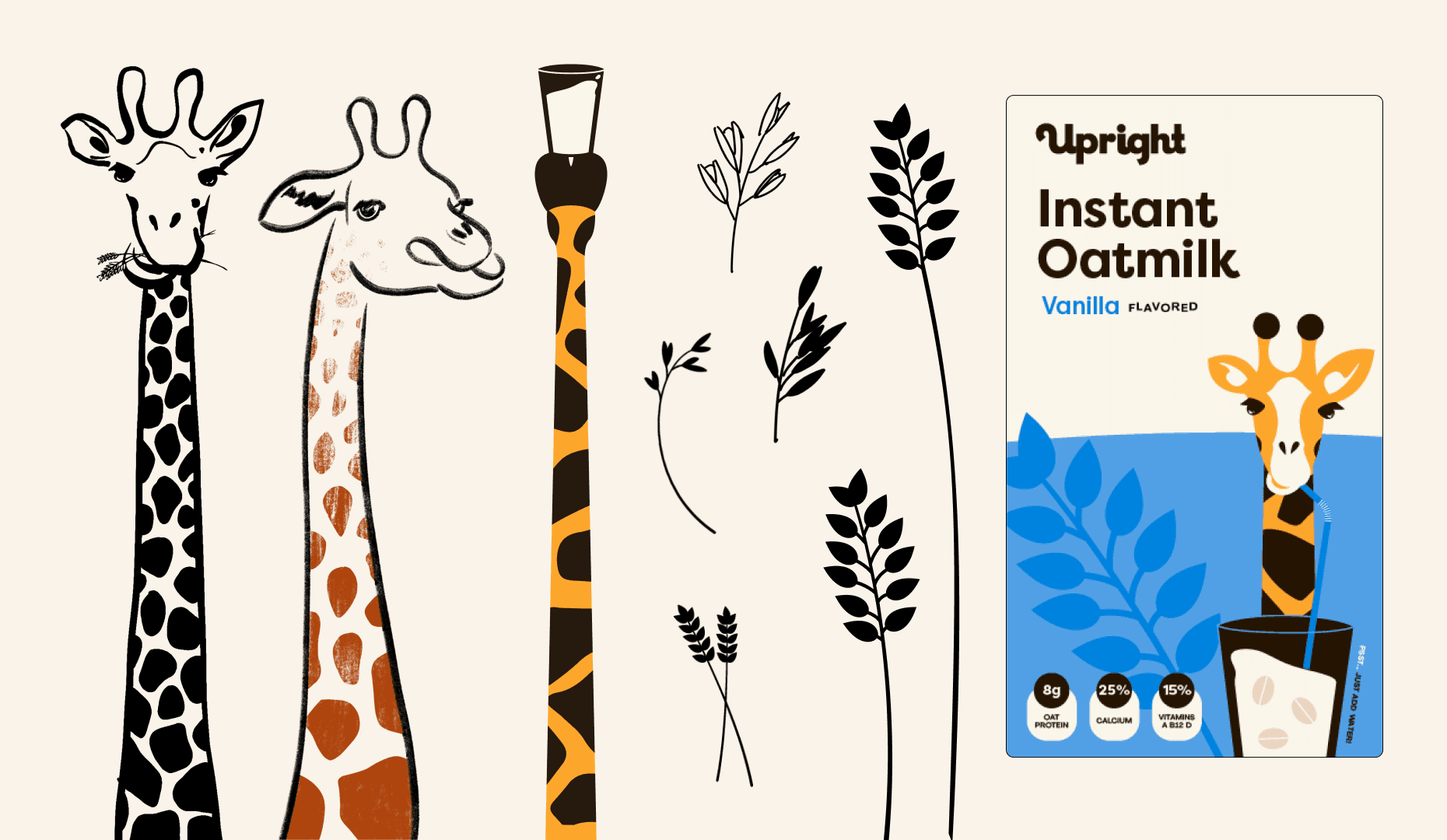 Jeffrey the Giraffe is old news, meet Jessie, the new mascot of Upright Oats. While working directly under the lead designer, I led the full creative development of the mascot illustration, exploring multiple concepts to bring Jessie to life. Upright Oats provides nutritious, plant-based milk that benefits both communities and the planet. This project centered on creating a playful brand identity driven by illustration. Jessie the Giraffe was developed to embody personality, intrigue, and charisma, adding a memorable, engaging presence to the brand as one of the only pediatrician approved oat milks out there.